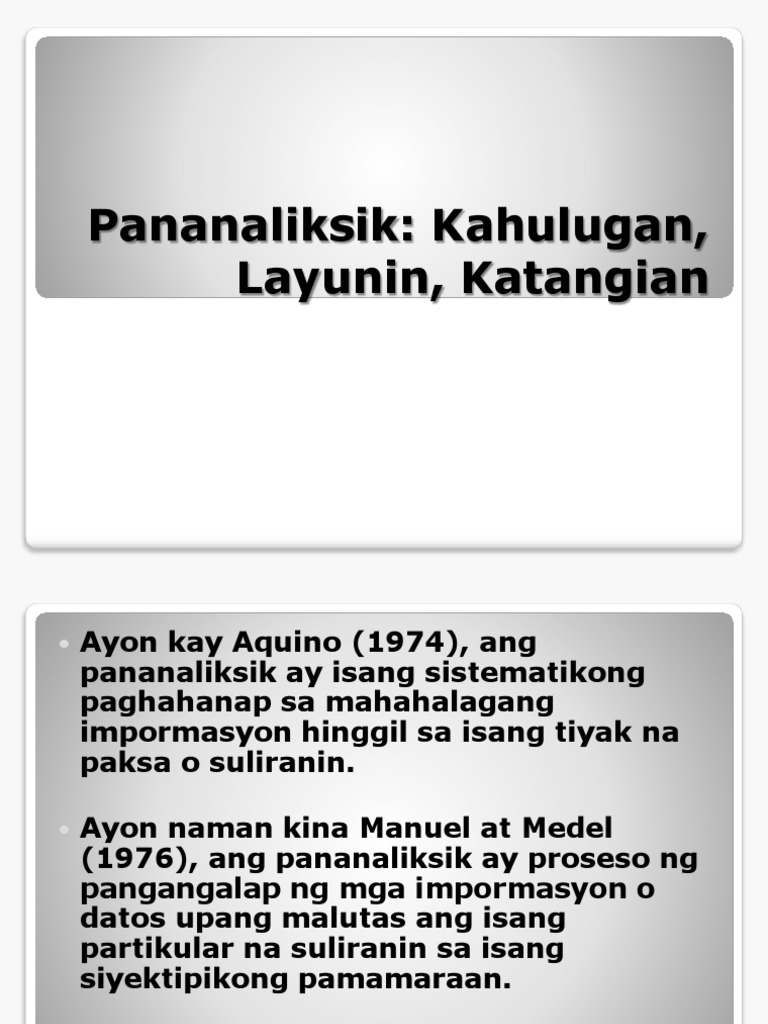 KAHULUGAN NG PANANALIKSIK f KAHULUGAN NG PANANALIKSIK 1Masusi 2Pagsisiyasat 3Pag-aaral 4Nagbibigay-linaw 5Nagpapatunay at Nagpapasubali fKATANGIAN NG PANANALIKSIK f KATANGIAN NG PANANALIKSIK 1Obhetibo 2Marami at ibat iba ang mga ginagamit na datos 3May pamamaraan o. Nadaragdagan ang kaalaman- ang gawaing pananaliksik ay isang bagong kaalaman kaninuman dahil nahuhubog dito ang kanyang kamalayan sa larangan ng pananaliksik.