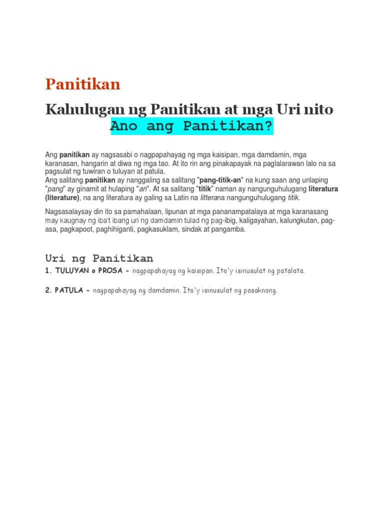 PANITIKAN Sa paksang ito malalaman natin ang kahulugan ng panitikan ang dalawang uri at ang dalawang anyo na may halimbawang akda ng bawat anyo. Non-fiction na mga sulatin at babasahinGinagamit ng mga manunulat ang kanilang imahinasyon para sa pagsulat ng mga akdang bungang-isip lamang. MGA IBAT IBANG KATUTURAN NG PANITIKAN.