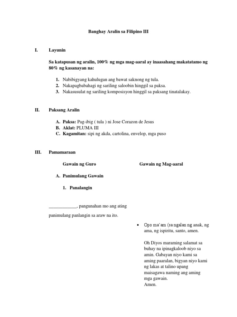 Sa pagtatapos ng aralin 80 ng mga mag-aaral ay. Napapahalagahan ang ugnayan ng personal na kagustuhan at pangangailangan sa pamamagitan ng debate. Mala-Masusing Banghay Aralin sa Fil III LayuninPaksang AralinPamamaraanEbalwasyonTakdang-Aralin Sa pamamagitan ng pagtalakay sa Sangkap ng Dula.