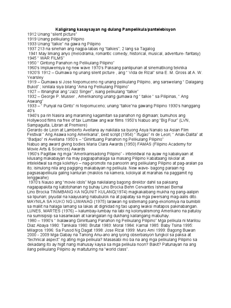 Kasaysayan ng Pelikula Ang kauna- unang nagawang Pelikulang ginawa ng Pilipinas ay ang Dalagang Bukid sa direksiyon ni Jose Nepomuceno noong 1919 base sa Zarzuela na isang higly-acclaimed MeloDrama ni Hermogenes Ilagan at ni Leon Ignacio Ang mga unang taga-gawa ng. Ang Kahulugan At Mga Palabas. Sa dulang pantanghalan ay limitado lamang na teknolohiya ang gamit dahil ito ay Live Performance.