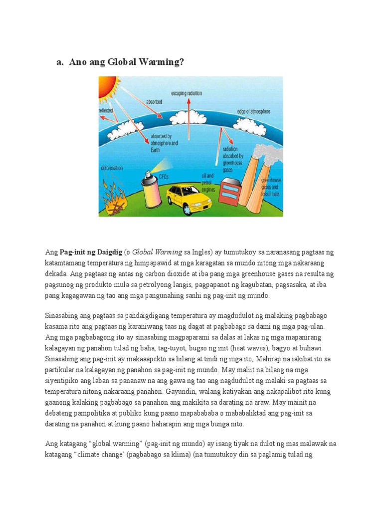 Ang global warming ay nagbabadya din sa mga. Sa ganitong paraan malalaman natin ang mga dahilan ng pagkasira ng ating atmosphere at magagawan natin ng paraan. Ang global warming ay isa sa mga pinaka seryoso na pagbabanta sa ating kapaligiran.