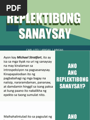 Balikang muli ang Talumpating Pampasigla ni AJ. REPLEKTIBONG SANAYSAY Sa paksang ito ating tatalakayin kung ano nga ba ang replektibong sanaysay at ang mga halimbawa nito. Kaiba sa pagsulat ng talambuhay na tumatalakay sa buhay ng isang tao ang pagsulat ng replektibong sanaysay ay naglalayong bigyang-katwiran ipaliwanag o SUriin ang partikular na salaysay at palutangin ang halaga nito o ang maidudulot nito depende sa layon ng manunulat sa buhay ng tao at sa lipunan Arrogante Golla Honor-Ballena 2010.
